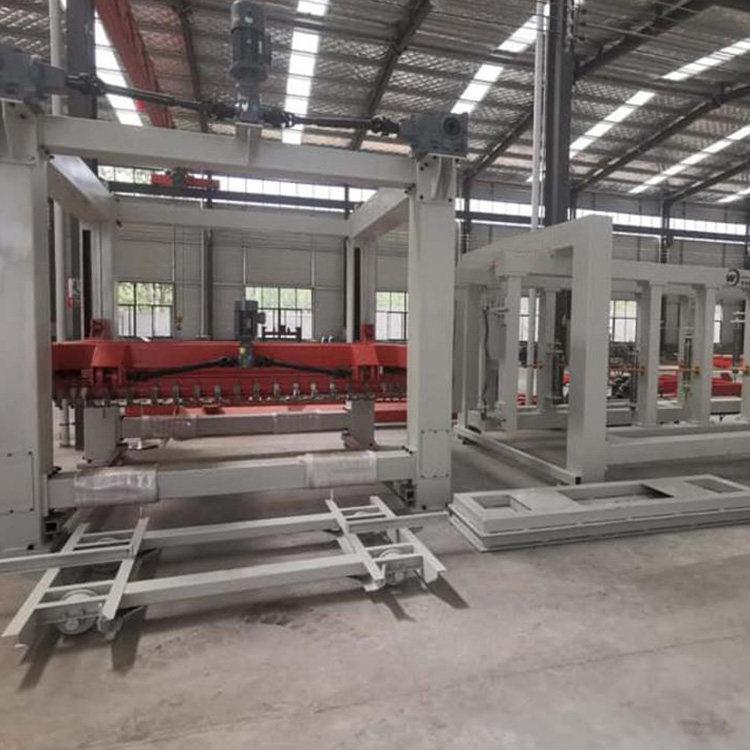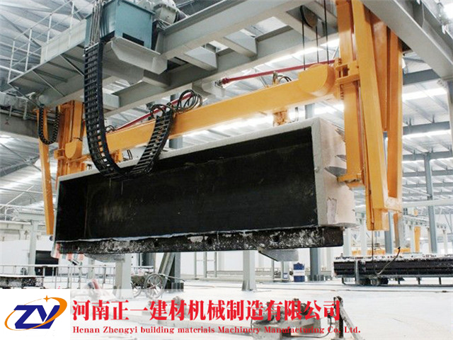 翻转吊具将坯体(带模具、侧板)在空中翻转90度,吊具放在切割台或切割小车上,脱去模框,坯体即能切割。